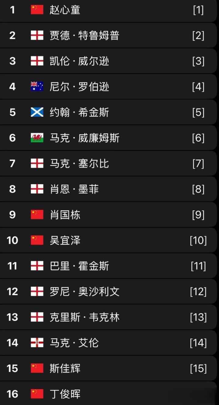 所以本次赛事的1号种子是赵心童、2号种子是特鲁姆普、3号种子是凯伦威尔逊、4号种子是尼尔罗伯逊、5号种子是希金斯、6号种子是马叔、7号种子是塞尔比、8号种子是墨菲、9号种子是肖国栋、10号种子是吴宜泽、11号种子是霍金斯、12号种子是火箭、13号种子是韦克林、14号种子是艾伦、15号种子是斯佳辉,16号种子则是丁俊晖。